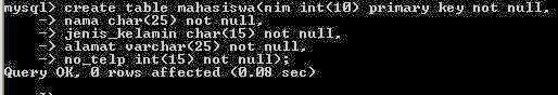 - Buat tabel : create table namatabel(atribut tipedata(panjangdata)